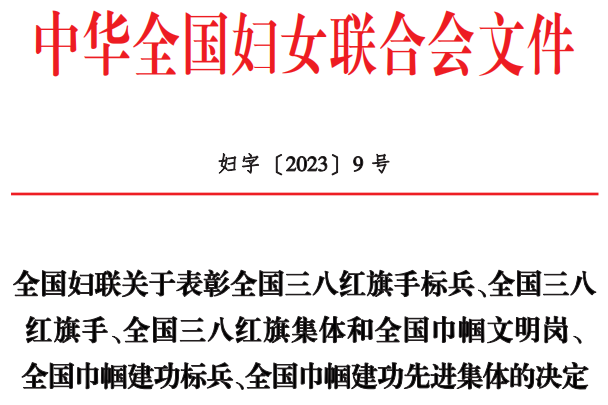 近日,中华全国妇女联合会印发《全国妇联关于表彰全国三八红旗手标兵、全国三八红旗手、全国三八红旗集体和全国巾帼文明岗、全国巾帼建功标兵、全国巾帼建功先进集体的决定》(妇字〔2023〕9号),九游ninegame控股集团办公室行政部上榜,获评“全国巾帼文明岗”。